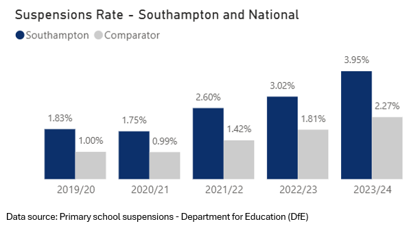 The Southampton Primary Suspension rate has increased year on year from 1.75% in 2020/21 to 3.95% in 2023/24. The England national Primary Suspension rate has also increased year on year over the same timeframe from 0.99% in 2020/21 to 2.27% in 2023/24.
