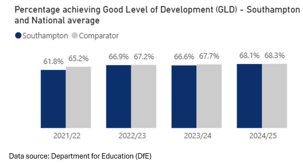 A pupil achieving the expected level in the Early Learning Goals (ELGs) within the three prime areas of learning (Communication and Language, Physical Development and Personal, Social and Emotional Development) and within Literacy and Mathematics is classed as having "a good level of development”. In 2025, 68.1% of pupils in Southampton achieved a Good Level of Development which was 0.2% below the England national average of 68.3%.