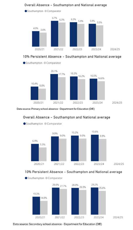It is noted that the Primary absence and Primary 10% persistent absence figures have decreased year on year for both the England national average and for Southampton since 2021/22.