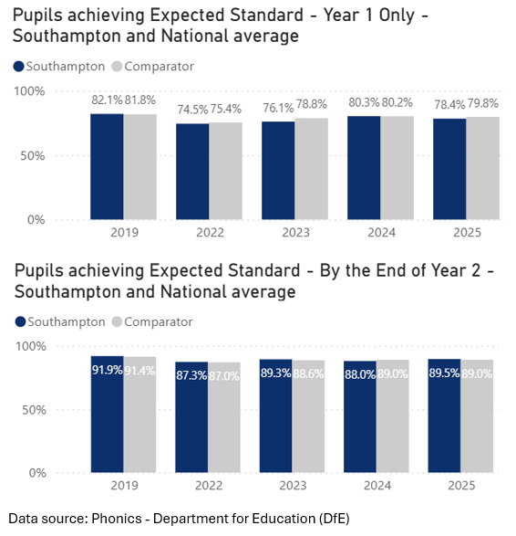 In 2025, 78.4% of Southampton’s Year 1 pupils achieved the expected standard in Phonics, which is 1.4% below the England national average of 79.8%, and 1.9% below the percentage of Year 1 Southampton pupils who achieved the expected standard in Phonics in 2024 (80.3%).