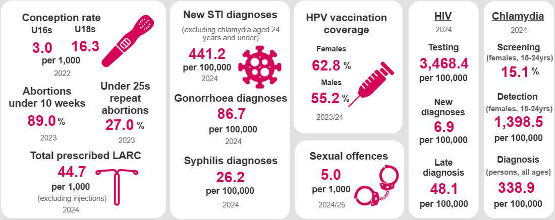 More information is available in the sexual health dashboard and resources section below, covering a range of topics including sexually transmitted infections (STIs), HIV, reproductive health, and contraception.