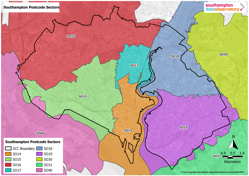 A map of the postcode sectors in Southampton and surrounding area. Indicating the postcodes inside the Southampton city boundary.