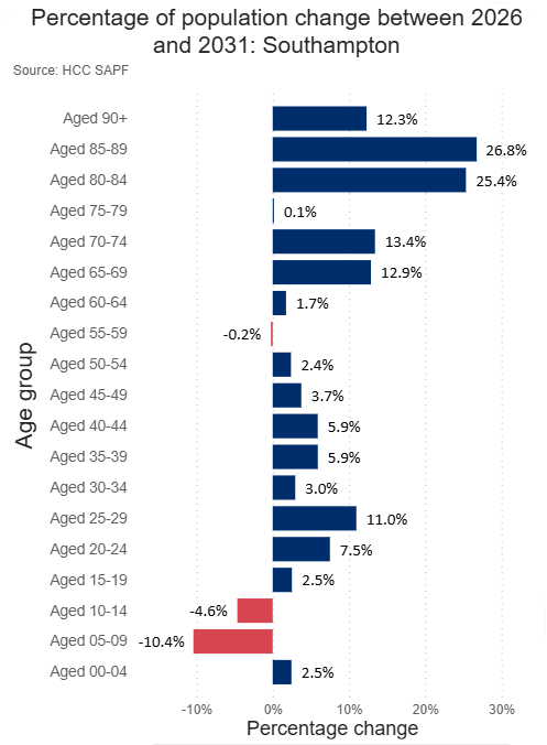 The older population is projected to grow proportionately more than any other group in Southampton in the next few years. The over 65 population is set to increase by 13.1%, or 4,940 people, between 2026 and 2031, with the over 75 population set to increase by 13.2%, or 2,394 people.